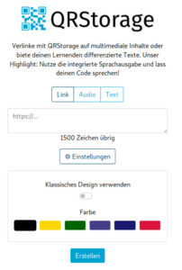 –  es kann statt Links/Text auch Sprache ausgeben, anonym über Google Text-to-Speech. Hierzu einfach den Button „Audio“ verwenden und den vorzulesenden Text eintippen! Das Scannen des QR-Codes führt zu einem Playbutton für die Sprachausgabe. Eine Aufnahme des Textes über Mikrophon ist daher nicht notwendig und die hörbare Ausgabe hinter dem QR-Code mit geringstem Aufwand herstellbar.